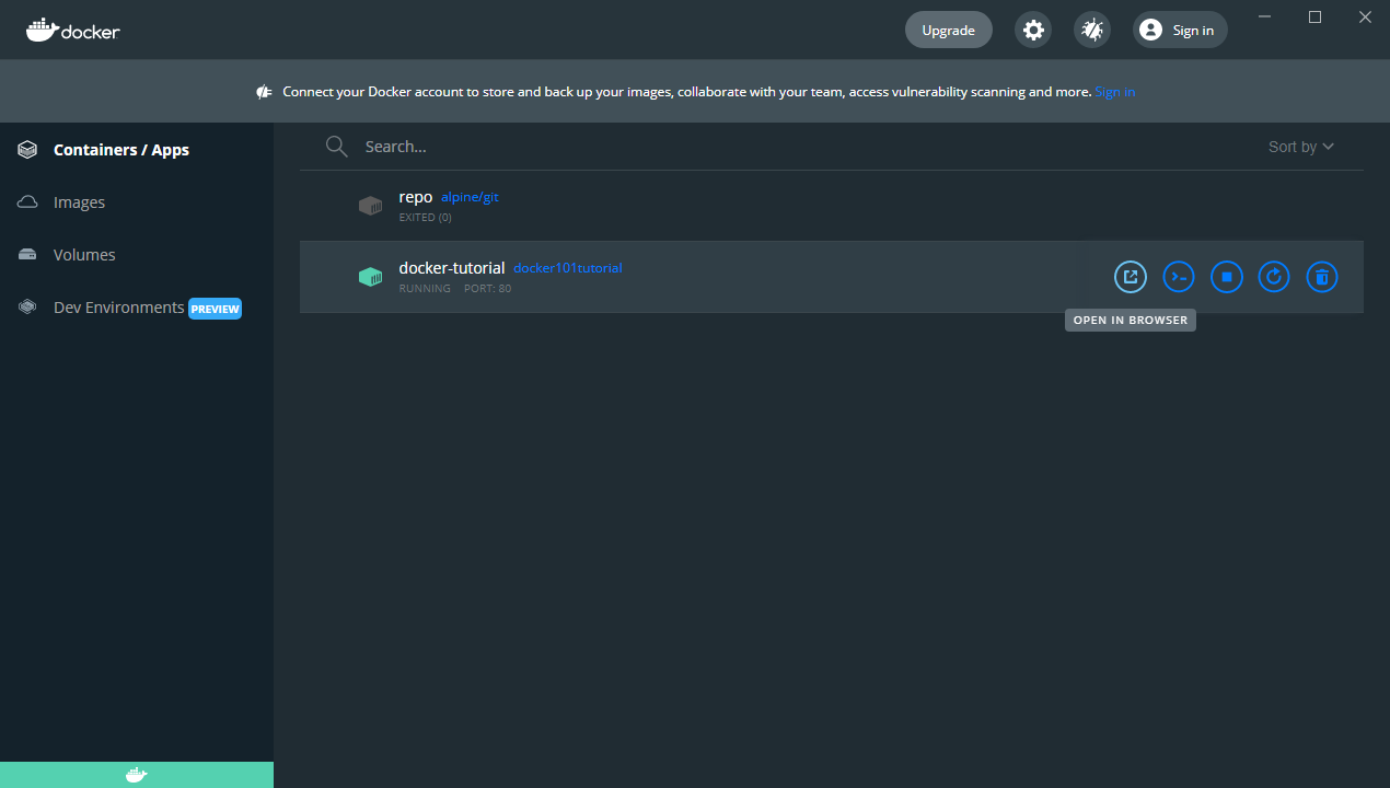 설치화면이 사라지고, 대시보드 화면을 보면 'docker-tutorial'이 실행중인 상태입니다. 여기서 오른쪽에 마우스를 올려보면 버튼이 5개가 보입니다. 왼쪽부터 '브라우저 열기','터미널','중지','재시작','삭제' 버튼입니다. 맨 왼쪽에 브라우저를 열게되면 튜토리얼 브라우저가 실행이 됩니다. 여기까지가 설치 진행 및 튜토리얼 설치 방법이였습니다. 저 또한 docker를 공부중이기에 공부를 하면서 자세하게 정리를 할 예정입니다. 정보가 도움이 되셨길 바라겠습니다.