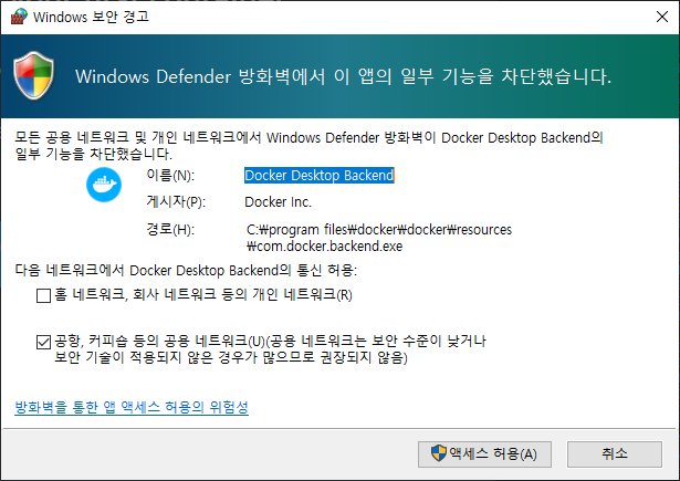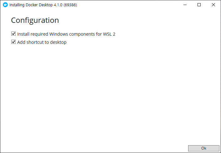 파일을 다운로드 받고 난 다음, 인스톨 파일을 실행하면, 필요로하는 패키지를 다운 받은 뒤, 옵션을 선택할 수 있는데 2번째 체크박스는 바탕화면에 바로가기를 생성할 것인지를 묻는것이기에 원하는데로 하시면 되지만, 첫번째의 경우 체크를 해지하지 말아주세요. 인스톨 파일을 설치하고 난 다음, WSL 2(리눅스용 윈도우 하위 시스템)를 설치하라는 경고가 뜨는데, 만일 이 체크를 해지하고 설치를 진행한 다음, WSL 2를 설치하게되면 Docker에서 WSL 2를 못찾는지 에러가 계속 발생하게 됩니다. 작성일 기준으로 에러가 발생했으며, 추후 업데이트를 통해 에러가 해결될 수 있지만, 체크해지하지 말고 그냥 설치하세요.