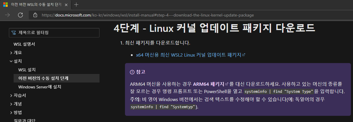 홈페이지에 들어가보시면 설명이 많이 있는데, 다른것은 다 무시하시고, 4단계에서 'x64 머신용 최신 WSL2 Linux 커널 업데이트 패키지'를 눌러 인스톨 파일을 다운받아서 설치를 해줍니다. 설치 옵션이 없기 때문에 쭉 설치를 해주시면 됩니다.