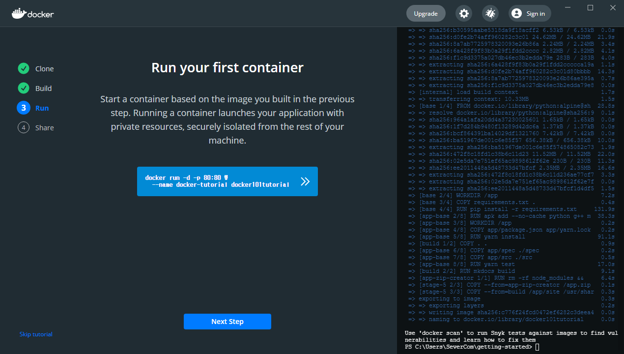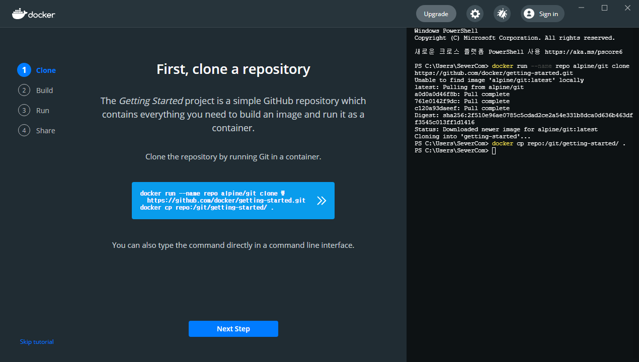 첫번째로 저장소를 클론하는 과정입니다. Docker에서 Github에 저장되어있는 코드[ URL : https://github.com/docker/getting-started ]를 클론하게되는 Github를 잘 모르시는분들이라면 인터넷 어딘가에 저장되어있는 코드를 끌어와서 쓴다고 생각하시면 됩니다. 가운데 파란박스안에 화살표버튼울 눌러주시면, 터미널에 파란박스안의 코드를 자동으로 붙여넣고 명령어를 실행합니다. 할꺼 없이 구경하시면 됩니다.