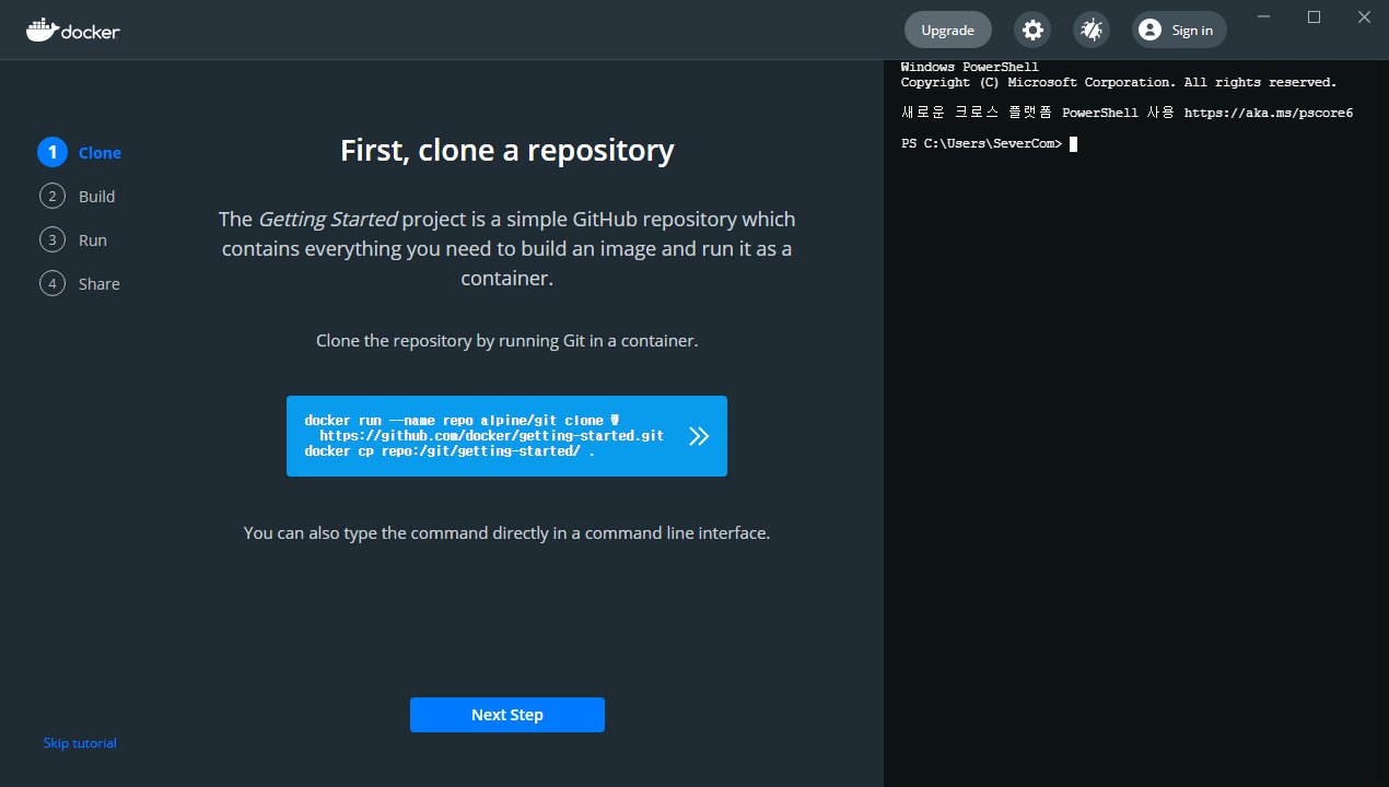 WSL2를 업데이트를 하고 Docker를 실행하면 위의 사진과 같은 화면을 보시게 되면 정상적으로 작동하게 됩니다. Docker를 잘 아시는분이라면 아래쪽에 작게 'Skip turtorial'를 눌러주셔도 되지만, 처음 시작하시는 분이라면 Docker turtorial image를 설치해서 컨테이너를 생성하시는걸 추천합니다. 'Start'버튼을 눌러주세요.