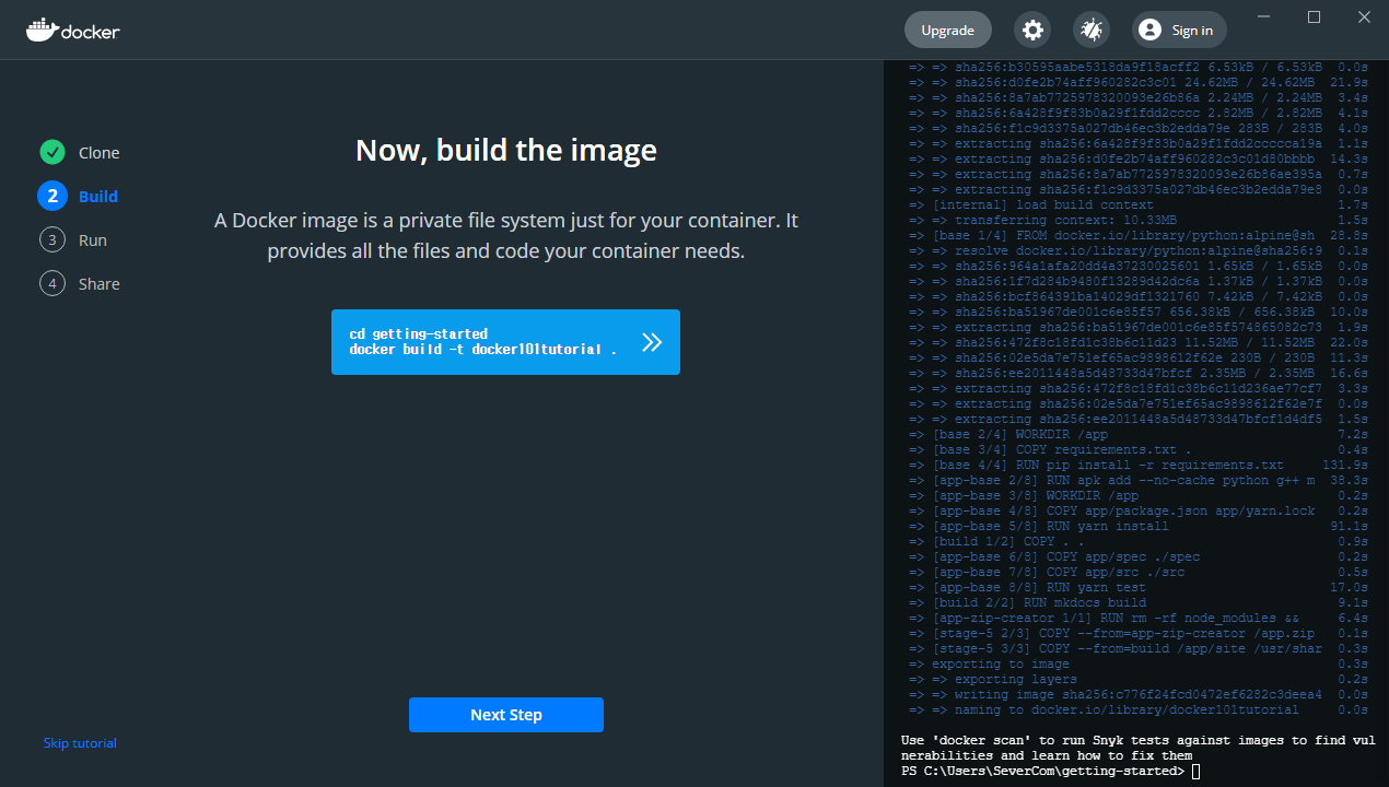 다음은 GIthub의 클론된 파일을 파란박스안에 명령어를 통해 image build를 진행하게 됩니다. 아까와 같이 파란박스안에 화살표모양의 버튼을 눌러주면 빌드가 시작됩니다. 빌드는 시간이 조금 걸리기에 완료가 될때까지 기다려줍니다. 터미널화면에서 빌드가 완료되고 다음 명령어를 기다리면 'Next Step'버튼을 눌러줍니다.