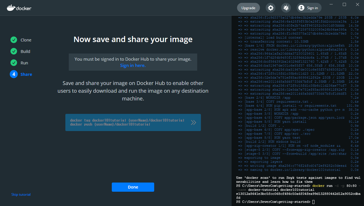 완료가 되었습니다. 여기서 Docker Hub에 이미지를 공유하기 위해서 회원가입을 해야된다고 하는데, 지금은 컴퓨터안에서 실습을 할 예정이기에 아직은 필요가 없다 봅니다. 아래쪽에 'Done'버튼을 눌러주시면 튜토리얼 (가이드) 설치가 완료됩니다.