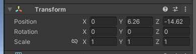 'Inspector'에서 설정한 포지션 'C#'코드로 작성을 하면 다음과 같습니다. 'Vector3(float x, float y, float z)'에 값을 대입하면 되는데, 이렇게 설정을 하게되면, 해당 좌표에 고정이 되는 방식입니다. 이 값을 변화를 줄 수 있도록 코드를 짜야됩니다.