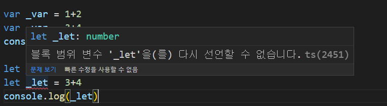 'VS Code'에서 코드를 작성해보면, 'var'키워드로 변수를 선언하면, 에러가 발생하지 않지만, 'let'키워드로 선언을 하면, 에러가 발생하는것을 볼 수 있습니다. 즉 'var'키워드로 변수를 선언하면, 같은 코드안에서 같은 변수이름으로 선언하고, 다른 값이 들어가게 된다면, 앞에 선언한 변수는 무시하고 앞의 값을 가져오게되, 원하는 결과값을 가져올 수 없어 코드 전체에 에러가 발생할 수 있습니다.