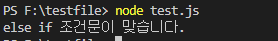 'if ~ else if ~ else'문은 2가지 이상의 조건문일 경우, 사용하게 됩니다. ' if ',' else if '의 ' () '괄호안에는 조건들을 작성하며, 조건들중 맞는 조건의 코드를 실행하며, 작성한 조건들이 맞지 않을경우 'else' 안의 코드를 작동하게 됩니다. 위의 코드의 경우 ' else if '안의 조건이 맞아, 해당 코드가 실행된 모습을 볼 수 있습니다.