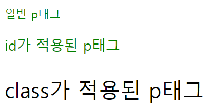 코드를 보면, <p>태그인 모든 태그에 글자색이 'green'으로 적용이 되었으며, 'id'가 적용된 <p>태그에만 'font-size'가 '20px'적용된 모습을 확인할 수 있습니다. 그리고 마지막으로 'class'가 적용된 <p>태그에만 'font-size : 20px','color:black'으로 적용되었는데요. 앞에서 p태그에 글자색을 'green'으로 적용했지만, 이걸 무시하고, 글자색이 'black'으로 적용된 모습을 확인할 수 있습니다.