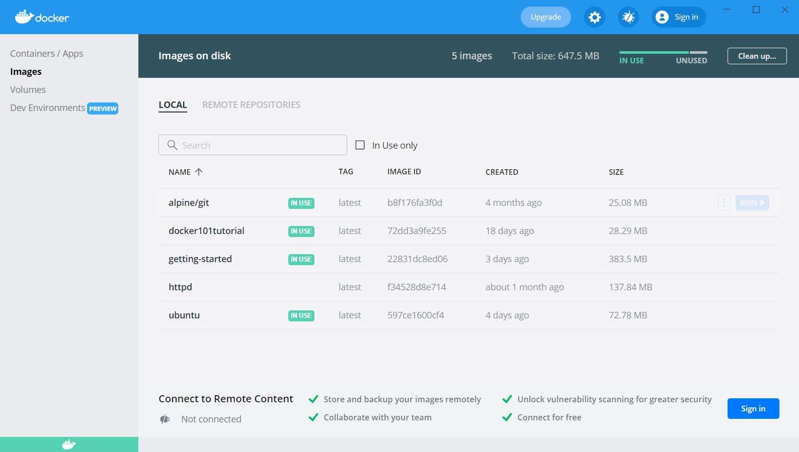 물론 docker Desktop의 image dashboard에서도 확인이 가능합니다. GUI가 편하신분들은 여기서 확인을 하시면 됩니다. 이미지 다운로드는 끝입니다. 인제 이 이미지를 이용하여 컨테이너를 생성하여 작업공간을 만들어보겠습니다.